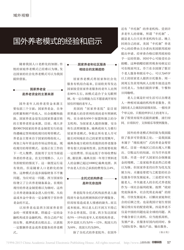 养老金主要来自于国家的税收收入, 能长时间地在自己的家里安度晚年。 供了很多可资借鉴之处:一是我国基